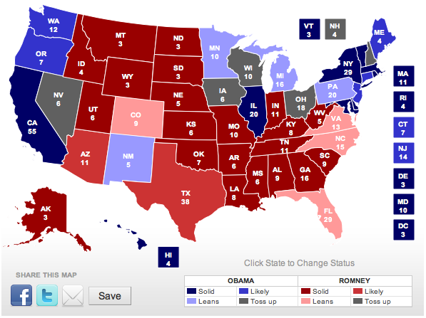 5. President Obama is slightly ahead in Ohio, but the race there seems destined to be decided by 25,000 votes or so. So I left it toss-up.