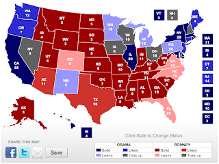 3. Polls indicate that Colorado is close and that Nevada is lean Obama. I was tempted to put Nevada in Obama's total, based largely on Mr. Ralston's view that the president will win the state. But I'm a week away from doing that. The Mormon vote there strikes me as a significant "x" factor. I am reasonably certain that Romney will win Colorado, based on a lot of input from friends in the state and pollsters whose judgement I trust.